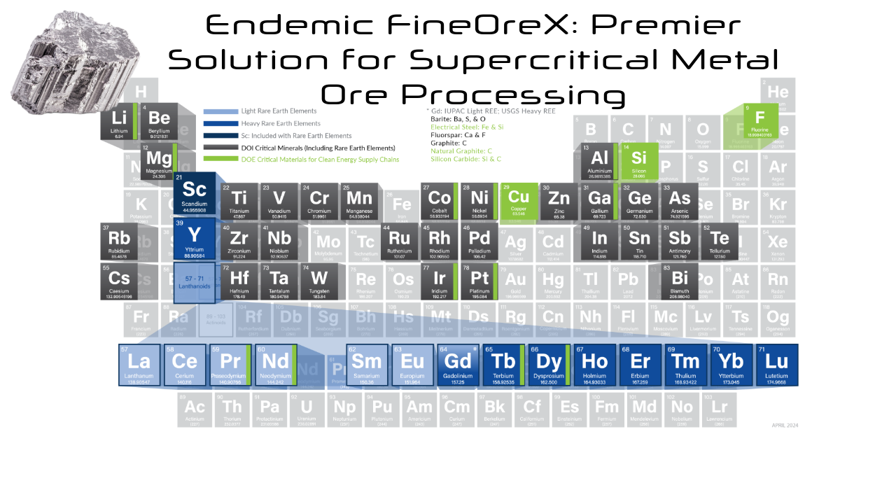 Endemic FineOreX: Supercritical Metal Ore Processing for Rare Earth Recovery Endemic FineOreX is a state-of-the-art solution for supercritical metal ore processing, focusing on the recovery of rare earth metals using supercritical fluid extraction. Designed for industries seeking green regenerative mineral ore processing solutions, this technology provides a highly efficient, low-waste method for extracting valuable metals from ores, including rare earths, palladium, and other precious metals.