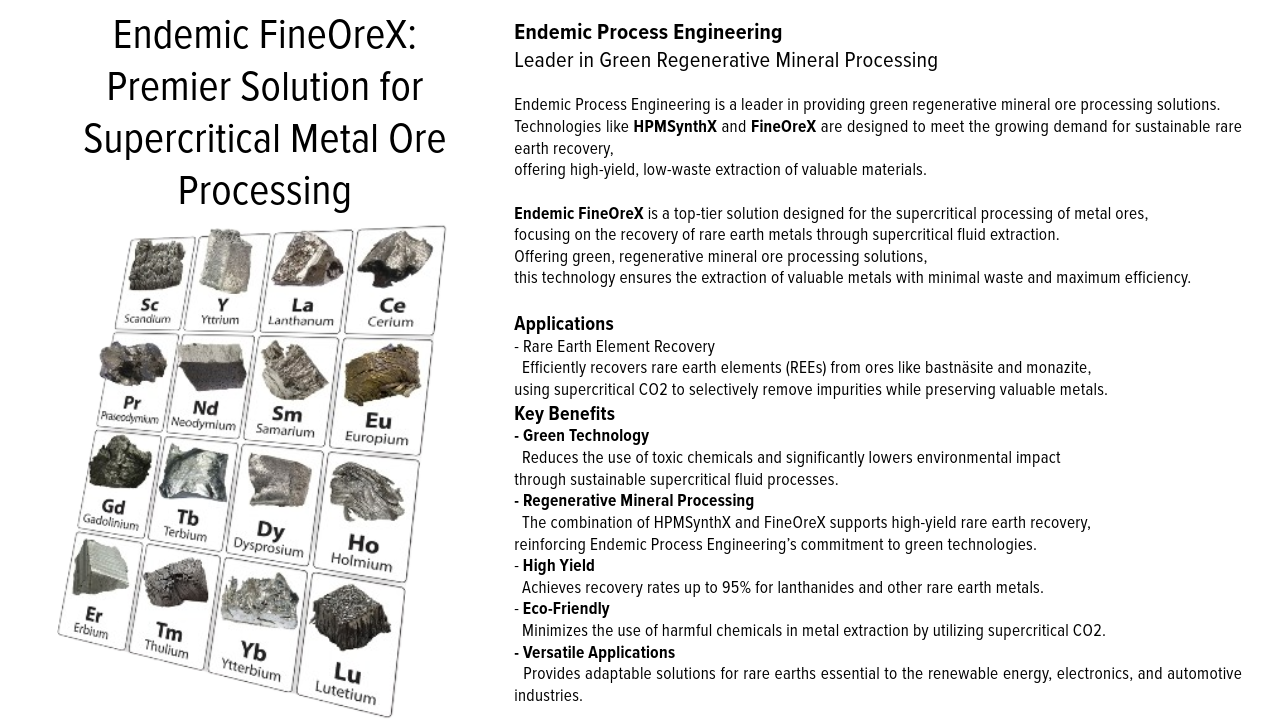 Endemic HPMSynthX: Advanced High-Pressure Material Synthesis Technology Endemic HPMSynthX, coupled with Endemic Xware v3.2, is designed for cutting-edge high-pressure material synthesis applications. It offers precision, scalability, and environmental sustainability, making it the ideal solution for industries that demand high-quality materials while minimizing environmental impact. The technology is widely used in both high-pressure synthesis of materials and supercritical metal ore processing, making it a versatile tool for a wide range of sectors.